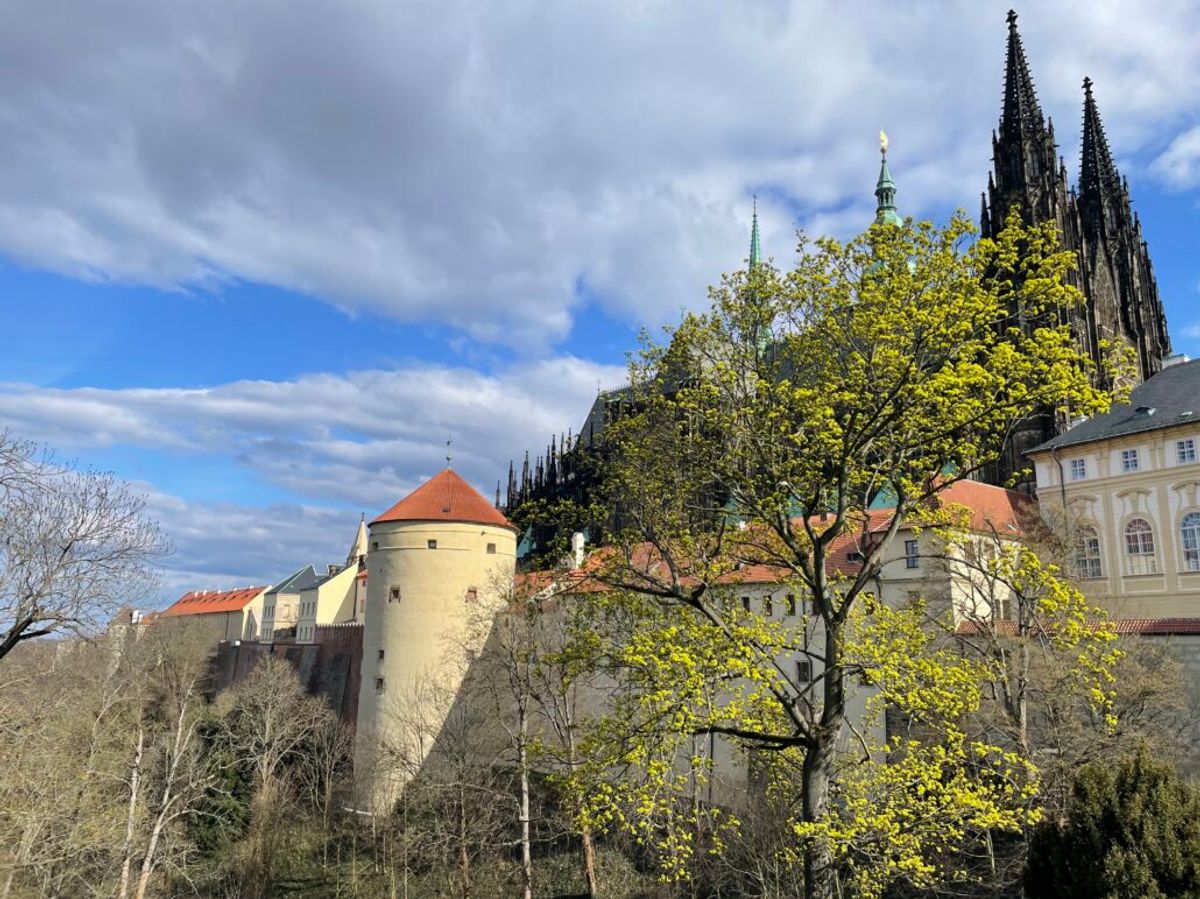 Pohled na Pražský hrad z Prašného most, kudy na simultánku můžete v sobotu 28. června přijít. Ta bílá válcová věž nad Jelením příkopem je Mihulka, tam alchymisté Rudolfa II. Začínali, a když jim byla malá, přesunuli se do prostor Slévárny, kde se bude hrát alternativní simultánka velmistrů Gürela a Navary. Budova Slévárny je lehce krytá stromy, přímo pod katedrálou Svatého Víta.